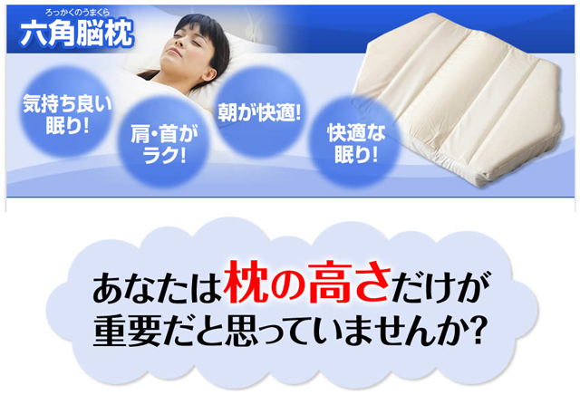 いま、日本人の10人に1人は不眠で悩むと言われる国民病となっています。 六角脳枕は、枕での悩み「肩こり」「頭痛」「首こり」「不眠症」などがラクになる 構造になっています。その秘密は「Wの凸凹構造」によって素晴らしい寝返り感を実現しています。 肩こり、首こり、頭痛で悩んでいる人、朝起きると頭痛がする人、いろいろな枕を試したけど自分に合う枕が見つけられない枕難民にオススメします。 30日間返品保障もついているので安心して購入いただけます。 |