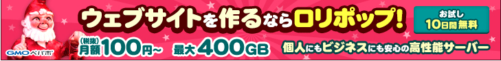 国内最大級の個人向けレンタルサーバー『ロリポップ!レンタルサーバー』は、 月額100円(税抜)~で容量最大400GB!しかも安いだけじゃなく 大人気WordPressの簡単インストール/ウェブメーラーなど 機能も満載!共有/独自SSLもバッチリ対応でセキュリティ対策も万全! もちろん、オンラインマニュアルやライブチャットなど、 充実したサポートで初心者の方でも安心です。 無料のお試し期間が10日間ありますので、 まずはお気軽にご利用してみてくださいね